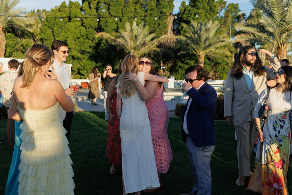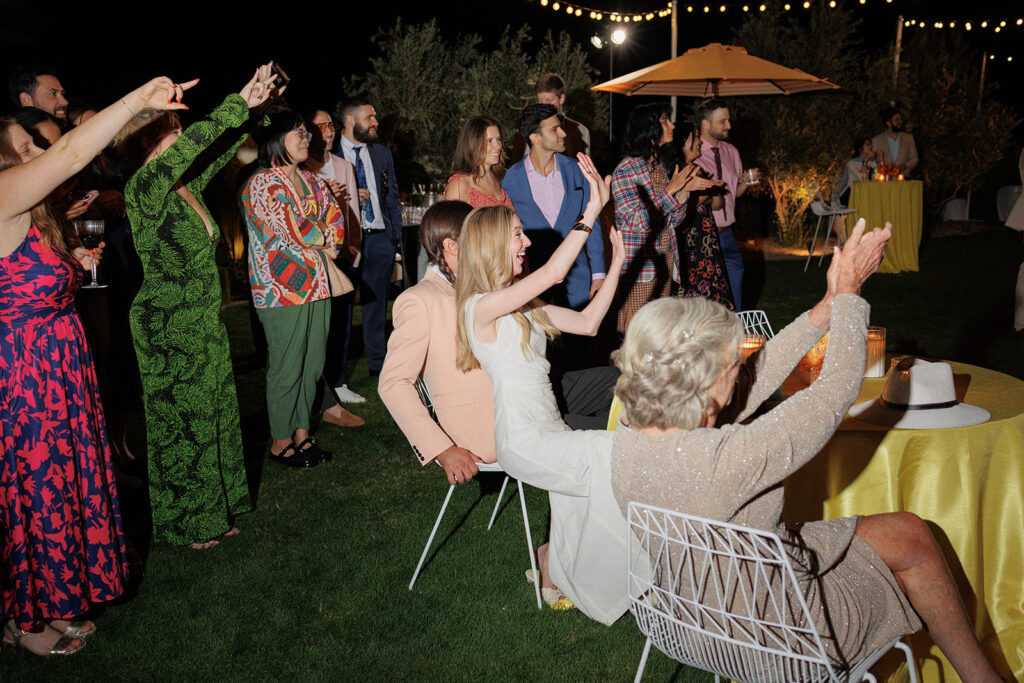 Timing is everything, so J&J planned accordingly for cocktail hour to begin around an hour before sunset. The golden light pooled (literally) around the courtyard as everyone enjoyed drinks, hugged, and took photos together.