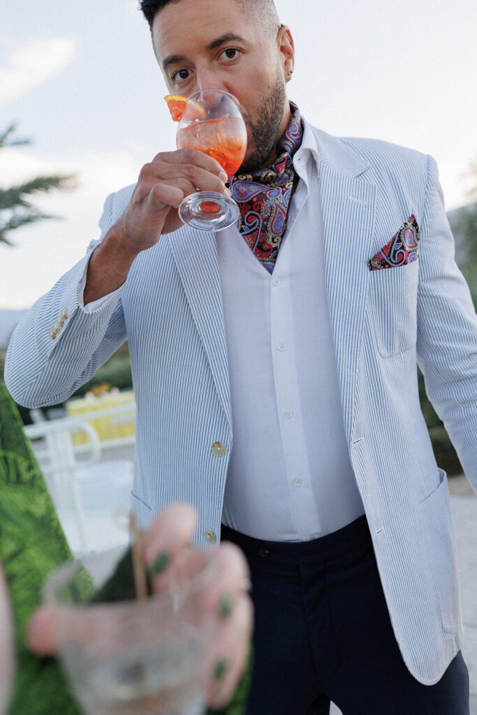 Jackie and Jack told me that their wedding inspiration came straight from “Poolside Glamour” by Slim Aarons. Honestly, say LESS! My dream come true! They hoped guests would catch the vibe and arrive in prints, patterns, and bright hued-colors. Can I just say, the people DELIVERED! The fashion completely set the tone. High ponytails, scarves, feathers, ruffles… we had coordinated suits, wide brimmed hats, and tropical prints make an appearance. Combined with the stunning midcentury venue, I honestly felt like I had walked onto a movie set.